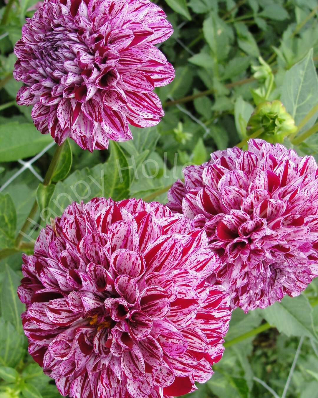 - 4" dark rosy and white colored ball bloom with dark red variegation present