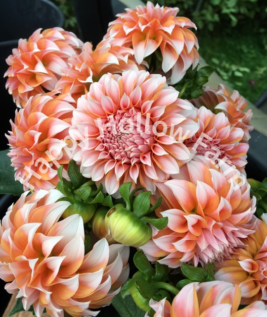 - A 4" blossom of warm-peach and white petals. Very sought after for its color. No two flowers are the same on this bicolor. Petals curve backwards.